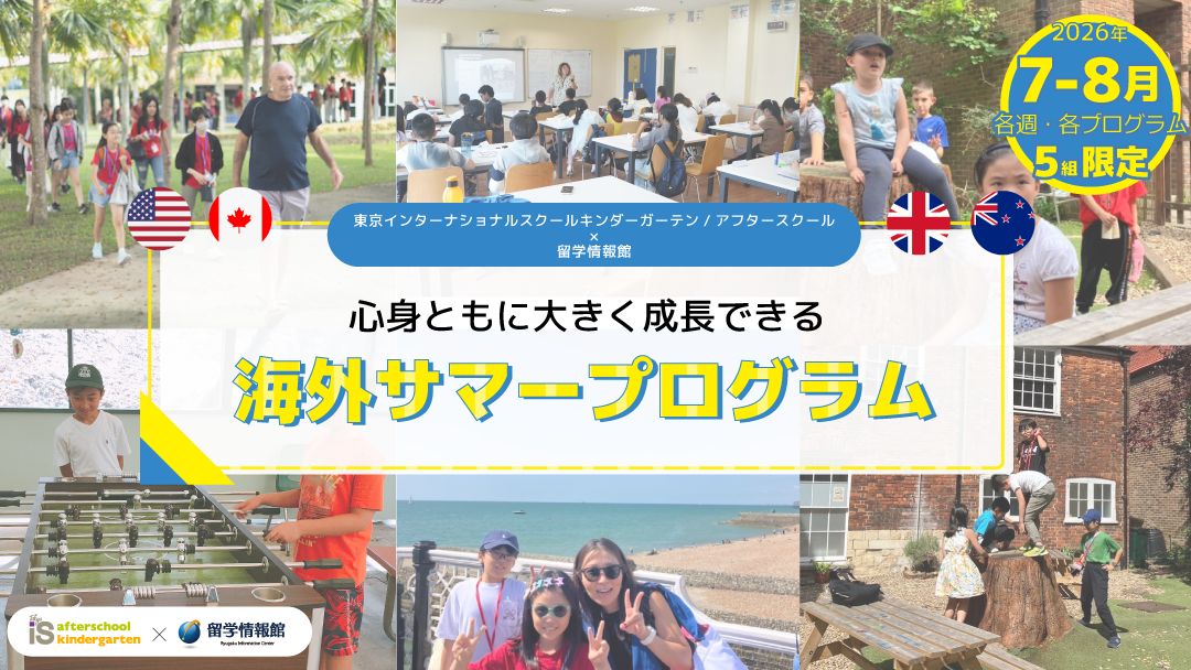当スクールで学んでいる英語やグローバルスキルの成長に大きな一歩を踏み出せる、海外サマープログラムに参加してみませんか? 株式会社留学情報館との提携で、東京インターナショナルスクール キンダーガーテン/…